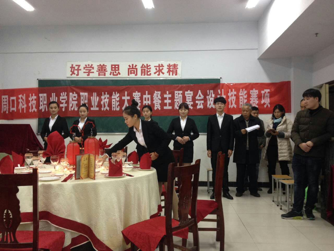接下來是緊張激烈的比賽,中式擺臺選手從容鎮(zhèn)定,又保證了比賽按時完成,福星高照主題使觀眾眼前一亮,中間大紅燈籠配上周圍飛揚的燭光,點亮了大賽的激情,仿佛預(yù)示著我們經(jīng)管系和我們周口科技職業(yè)學(xué)院未來一定福星高照,走上新臺階。悅耳的古箏琵琶配樂使現(xiàn)場觀眾和評委融入比賽主題中。