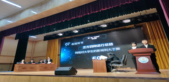 決賽中對峙的分別來自9001cc金沙的“不拿冠軍就是我不對”隊和辯論社“唔西迪西瑪卡巴卡”隊,辯論的主題是“網(wǎng)絡(luò)對大學(xué)生的影響是利大于弊還是弊大于利?”主持人簡單介紹評委嘉賓和兩方辯手后,比賽即開始了。雙方的開篇陳詞都十分犀利,評委嘉賓都被他們的氣勢和精彩言論所吸引。雙方的二、三辯也將攻辯階段打得十分有激情,他們拋給對方雙關(guān)性比較強的難題,回答對方的問題也是臨危不懼。而最激情四溢還是自由辯論環(huán)節(jié)莫屬了,兩方辯手據(jù)理力辯、你推我擋,既激情盎然又從容不迫,而臺下觀眾也聽得熱血沸騰,恨不得上臺同辯手們爭個雌雄。雙方四辯的總結(jié)陳詞不僅指出對方在比賽過程中暴露的問題,還分點論述更加強了自方的觀點。比賽結(jié)束后,評委們對此次比賽進行了詳細點評。她細評了各方的優(yōu)點和不足,肯定了辯論過程中一些精彩指出,也惋惜在自由辯論階段中一些暴露出來卻沒有被提出的論點,整場比賽都被她剖析得精細而準確。最終經(jīng)過激烈的辯論,聽取評委意見并收集票數(shù)后“不拿冠軍就是我不對”最終確定決賽的勝利。比賽結(jié)束后尚尚處長對比賽的兩個隊伍進行了精彩點評,同時也對廣大學(xué)生提出了新的價值觀念,也鼓勵我們廣大學(xué)生砥礪前行,奮勇向前。